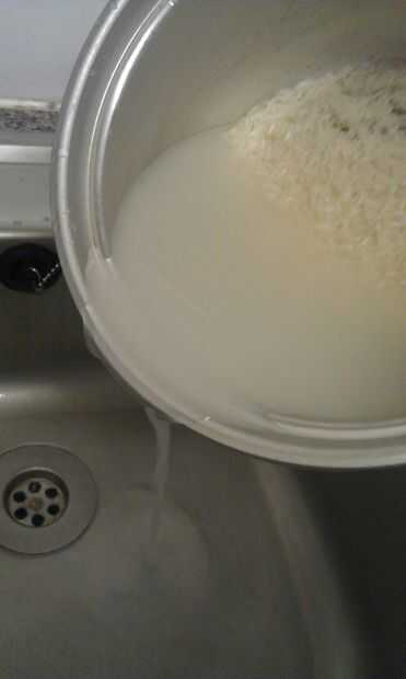 1) comenzar con necesita enjuague bien el arroz, esto es para quitar el exceso de almidón en el arroz, así como cualquier plaguicidas y gérmenes. Generalmente 2 a 3 enjuagues con agua tibia es suficiente para limpiar pero te puede aclarar un par de veces extra si es necesario.