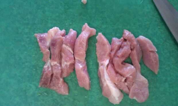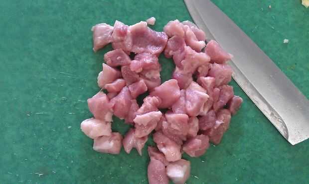 4) cortar las dos piezas de carne de cerdo en cubitos