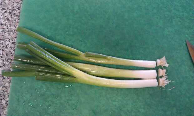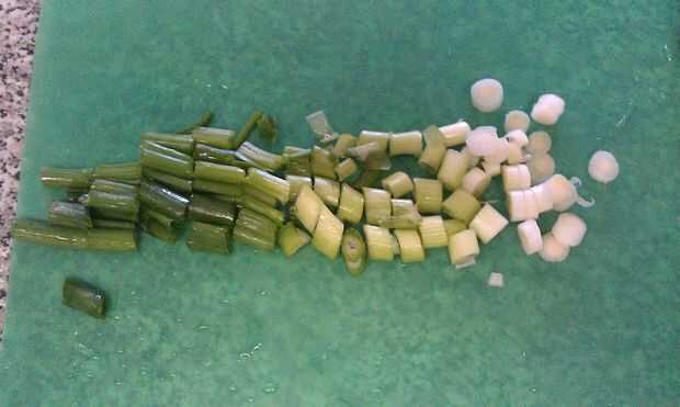 2) al cortar las cebollas de primavera hacer seguro que eliminas la parte que tiene raíces primero antes de corte para arriba en pedazos más pequeños