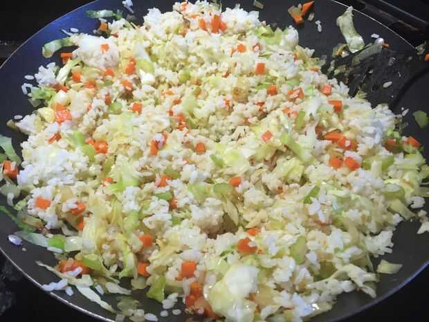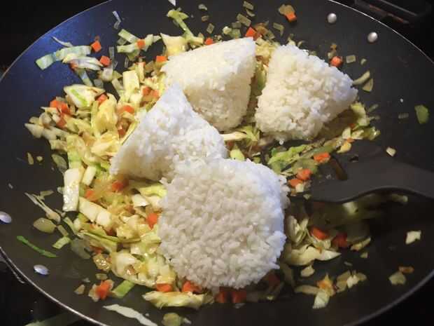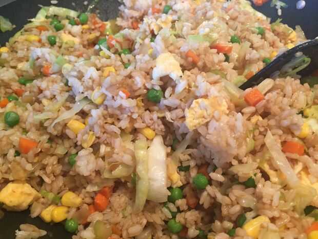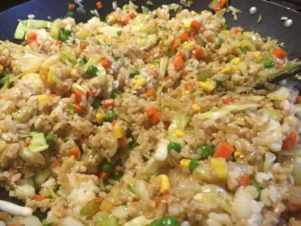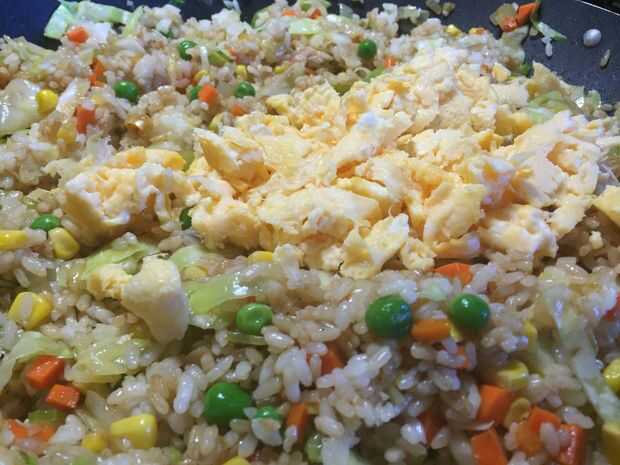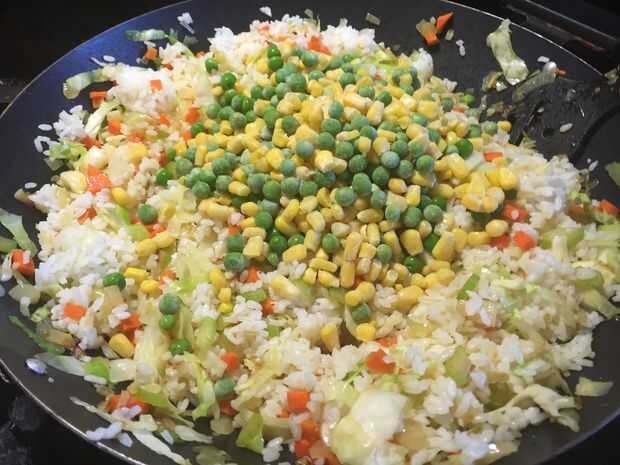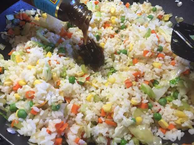 Una vez que las verduras frescas se cocinan en la olla agregar el arroz previamente cocido y revuelve durante 1 minuto aproximadamente para romperse aparte. A continuación añadir los guisantes congelados y maíz, huevos revueltos, salsa de ostras y salsa de soja y revolver el arroz y las verduras hasta que están uniformemente cubiertos con las diferentes salsas.