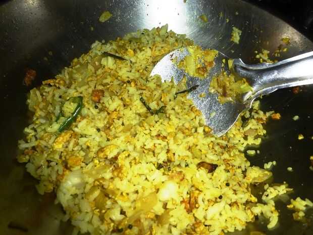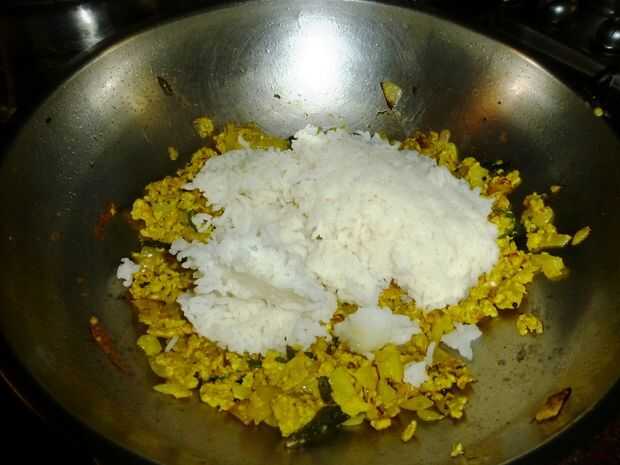 1. Cuando los huevos revueltos está listo, añadir dos tazas de arroz cocido a la cacerola