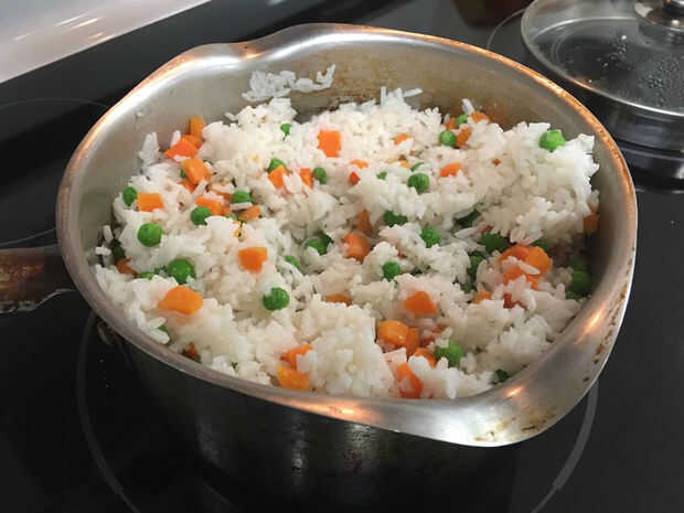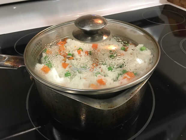 Cuando el arroz esté cocido, apagar el fuego y verter en la bolsa de guisantes congelados y las zanahorias. Revuelva hasta combinar bien. Coloque la tapa en la sartén. Reposar durante 15 minutos.