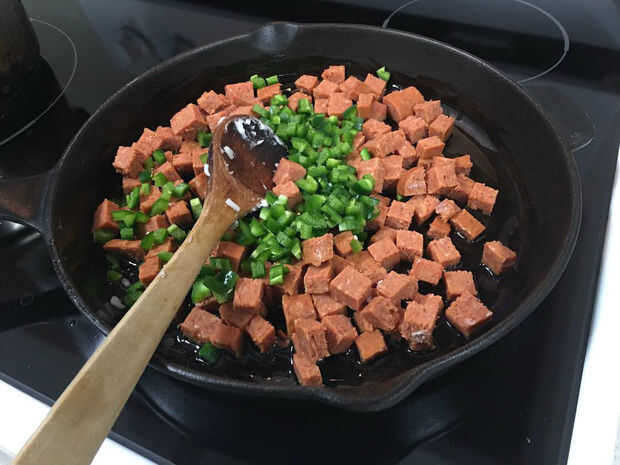 Coloque 2 cucharadas manteca en sartén grande, encender calor medio. Agregar SPAM y Chile Jalapeño. Revolver mientras se cocina por 3 minutos.