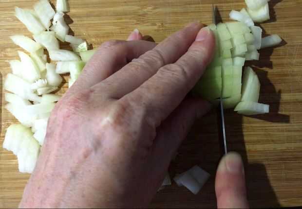 Pelar la cebolla y el ajo y picar en trozos finos.