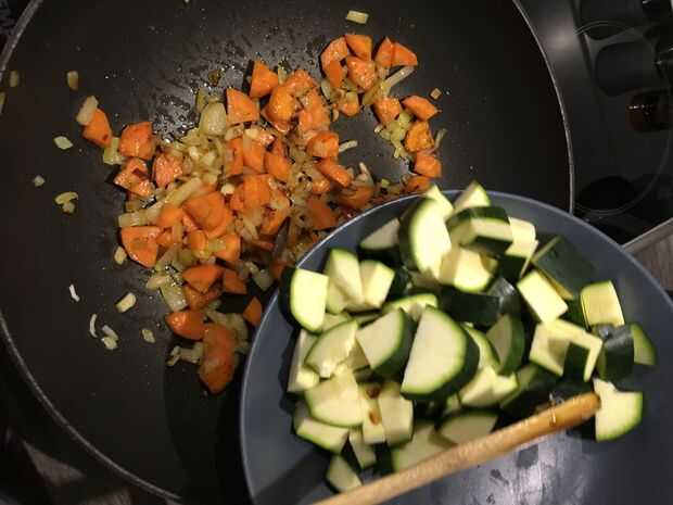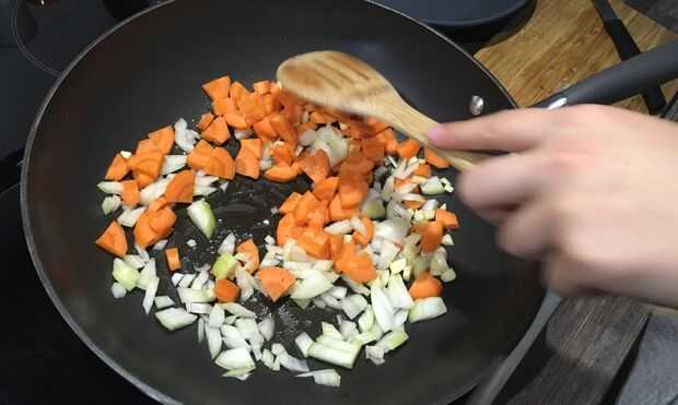 Poner la zanahoria en cuadritos, la cebolla y el ajo en la sartén y dejar reposar durante 1-2 minutos.
