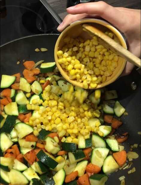 Luego coloque la calabacita en la cacerola, deja cocinar durante 2-3 minutos y añadir el maíz.