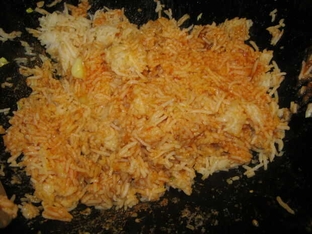 Siempre freímos el arroz en dos tandas, pero lo más importante es usar mucho aceite o mantequilla para freír el arroz. Nada sabe mejor que el arroz frito en porciones de mantequilla. Esto es donde agregas el puré de tomate, salsa picante, cilantro y salsa de ostras. Cuando casi se haya evaporado el líquido hacia fuera, añadir la sobras fritas y huevos en (la mitad si se fríe el arroz en dos tandas como soy). Los huevos terminen de cocinar y listo!