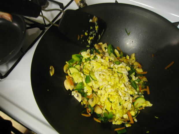 Cuando arroz ha terminado de cocinar, coloque las verduras, 1 T de mantequilla y huevos revueltos en un wok (sartén grande) y una parrilla por 5 minutos revolviendo constantemente a fuego med.