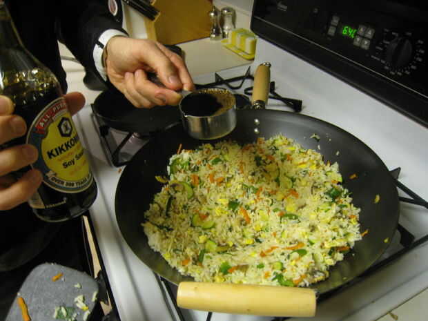 (a) Agregue 1/4 taza de salsa de soja en el arroz frito