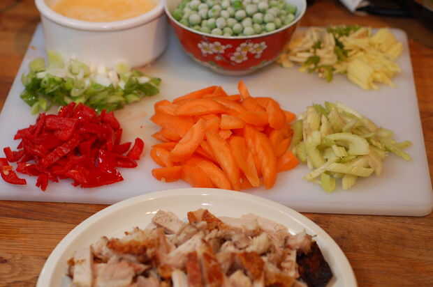 1 1/2 tazas de carne cocida - utiliza la izquierda overs de mi vientre de cerdo chino crujiente cocinada a fuego lento
