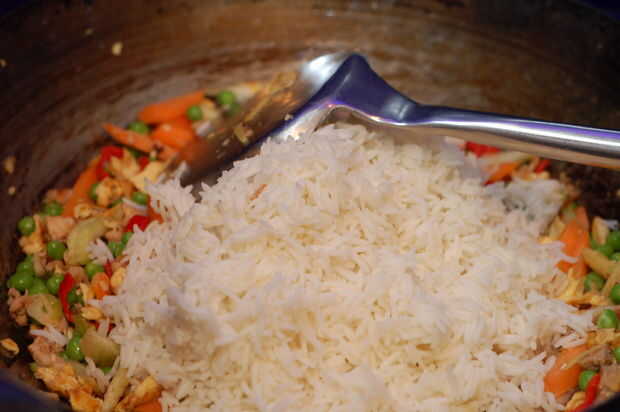 Añadir las verduras restantes entonces continúan mantener las cosas en movimiento para un par de minutos más y las verduras empiezan a cocinar a través de añadir entonces el arroz. Continuar la cocción y revuelva durante otros 3-5 minutos hasta que todo esté cocido a través y bien combinado.
