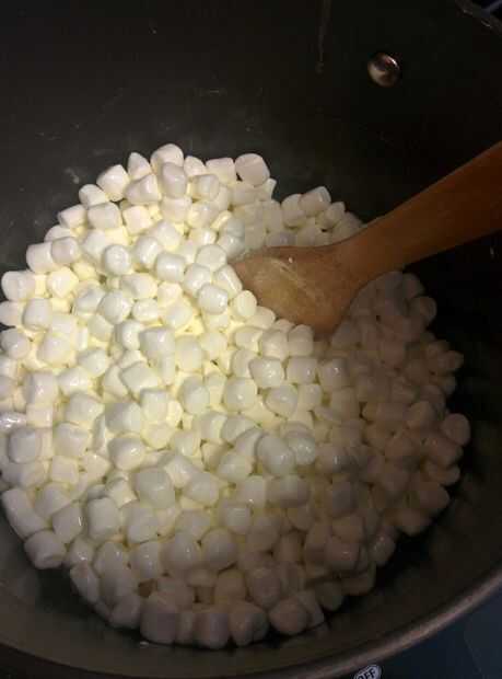 Vierte en 8 tazas de malvaviscos y revuelve constantemente hasta que los grumos hayan desaparecido. Pero tenga cuidado de no dejar cocinar demasiado o la trata terminan duro de masticar. Tan pronto como esté todo derretido, apague el quemador y mover el bote lejos del calor.