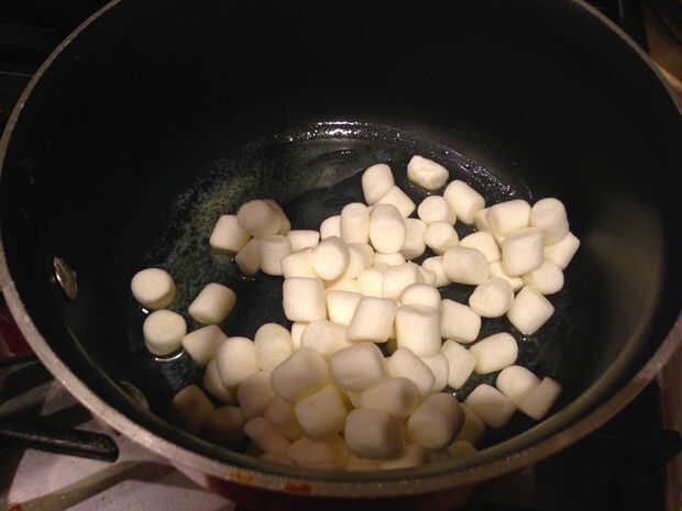 Derrita la mantequilla a fuego lento en una cacerola y mezcla malvaviscos hasta que se derrite totalmente, luego retirar del fuego.