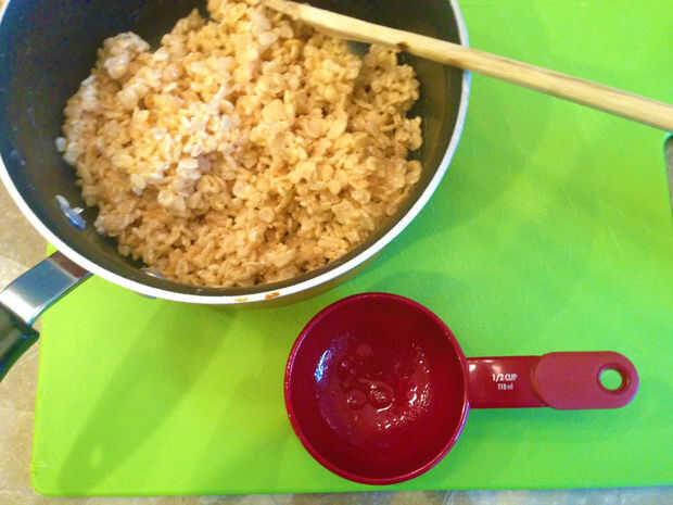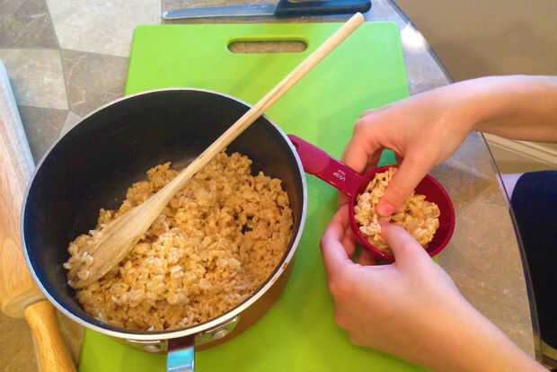 ADVERTENCIA!! Antes de este paso, espere hasta que la mezcla de krispies de arroz se enfríe para evitar quemaduras. Sin embargo, un poco caliente arroz krispies trata son más fáciles de molde de arroz frío completamente trata krispies para no dejarlo que se enfríe demasiado.