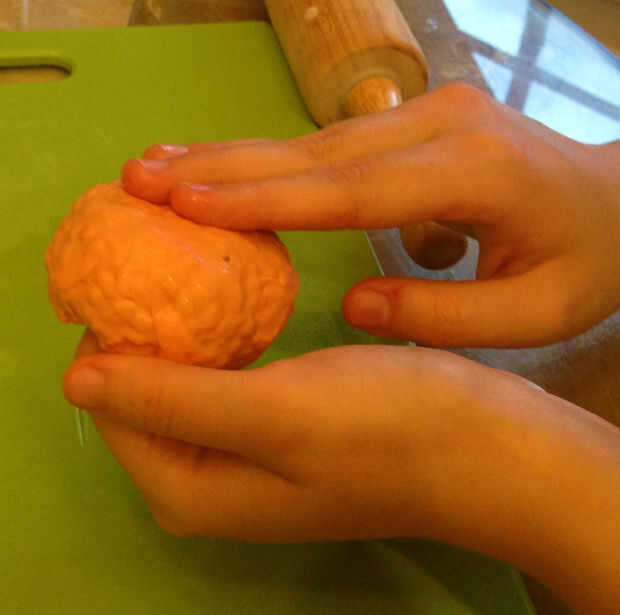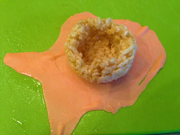 • Pelar cuidadosamente encima de los bordes para cubrir el recipiente en el fondant naranja.