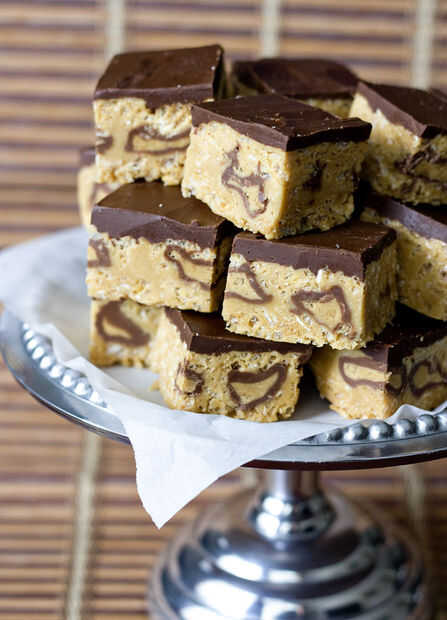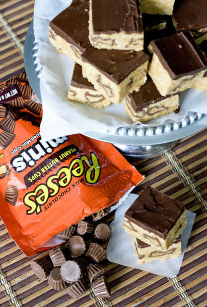 -Espolvoree las tazas mini mantequilla de maní sobre el fudge y presiónelas suavemente hacia el fudge.