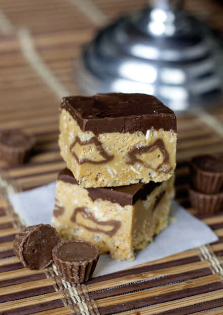 -Preparar la mezcla de Krispies de arroz como la primera capa, luego extiéndalo uniformemente sobre la capa de taza de mantequilla de maní. Ponga a un lado.