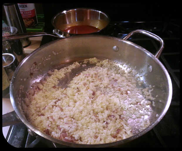 Reducir el fuego a bajo y añadir el arroz. Asegúrese de que no se quema el arroz removiendo durante 3-5 minutos.
