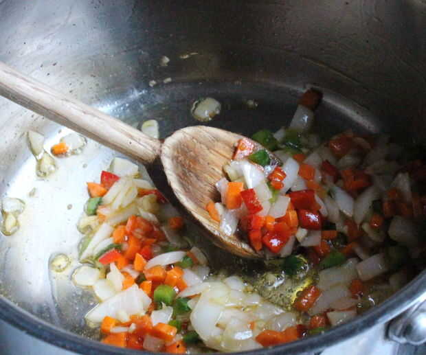 Calentar un poco de aceite de canola en un sartén sobre fuego medio. Añadir verduras (todo menos el tomate!) y cocine, revolviendo frecuentemente, hasta que empiecen a ablandar. Esto le llevará 2-3 minutos.