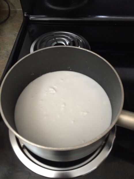 Para empezar a hacer el arroz, vierta una taza de agua, una lata de leche de coco y 1/2 una taza de azúcar en cualquier olla. Espere hasta que la mezcla hierva.
