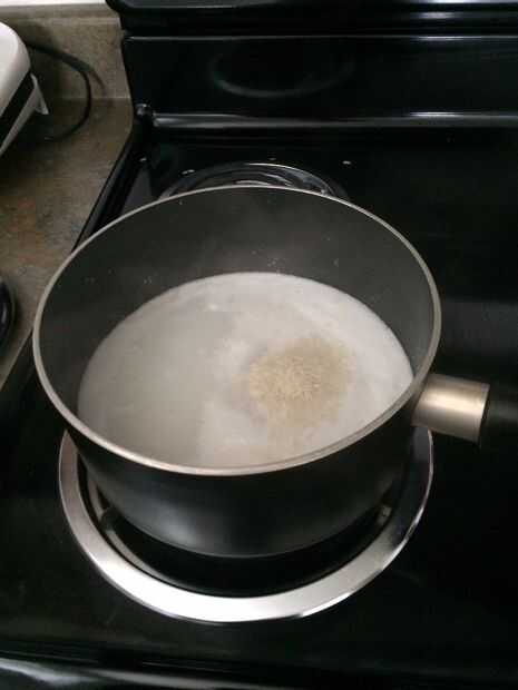 Una vez que hierva el agua y la leche de coco, añadir el arroz, baje el calor a bajo y lo deje reposar por 15 minutos o hasta que se evapore el agua.