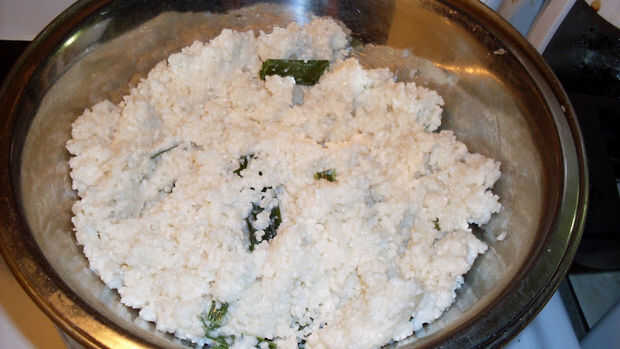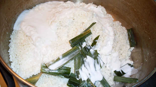 Si usted sólo Remoje el arroz pegajoso para el 2 h, enjuague, vapor, luego llevar a hervir con suficiente agua, luego escurrir y vapor otra vez. Pero si remojar el arroz por toda la noche (2 noches máximo), el arroz se romperá, por lo que tienes que hacer, lavar, hervir con leche de coco y el resto de los ingredientes en el fuego/calor bajo hasta que la leche de coco absorvido, entonces vapor hasta que esté listo. Deseche la hoja de pino del tornillo, luego presione arroz cocido en molde redondo de 9 pulgadas que ya untada con aceite espolvorear con maíz almidón entonces vapor otra vez