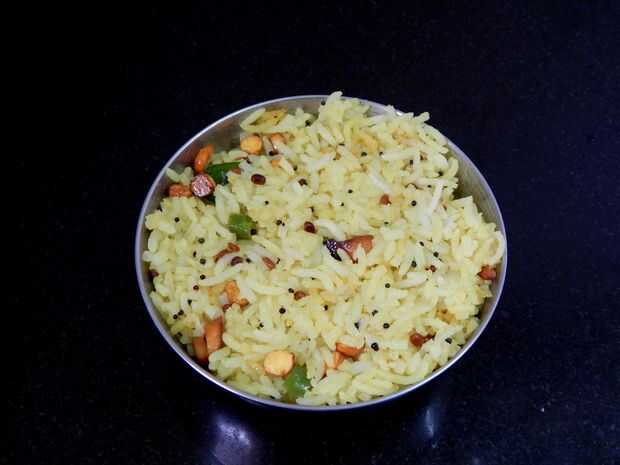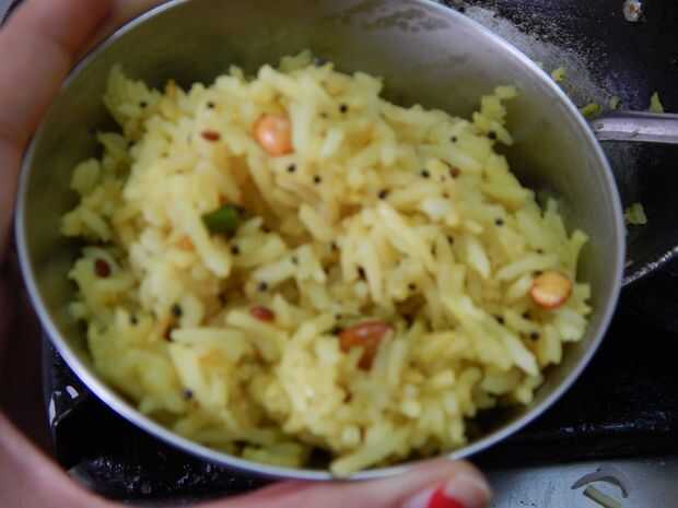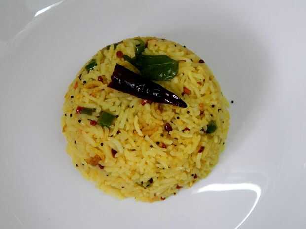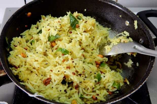 Añadir las hojas del curry, roto chiles rojos, chiles verdes, jengibre, cúrcuma, asafétida y continuar salteando. Añadir sal y mezclar. Arroz, limón jugo y mezcle bien.
