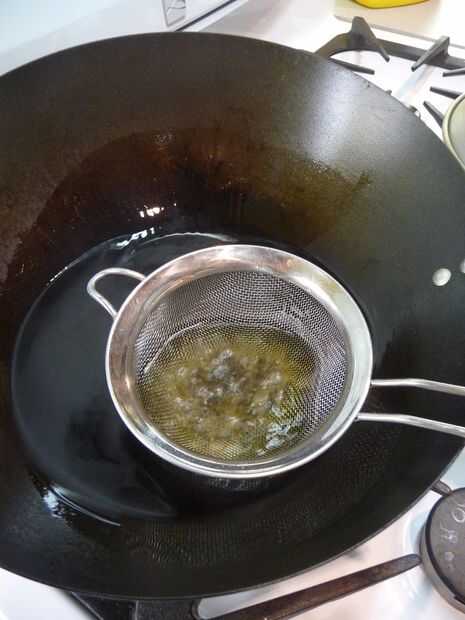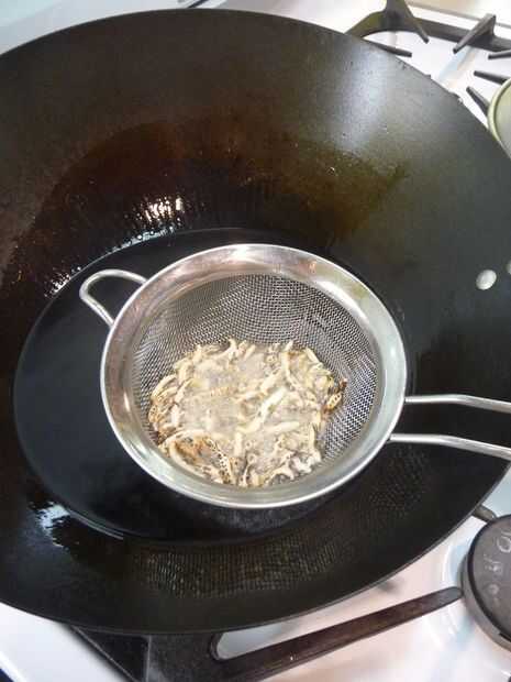 una vez que estén reventados se vacía el tamiz en el tazón de fuente o placa forrada con papel de cocina y agrega el condimento.