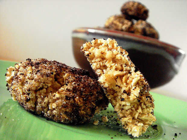 3. Coloque un recipiente con agua al lado de la bandeja para hornear. Forma y pack 1 cucharada de la masa de galleta, entonces usando los dedos humedecidos, humedezca la masa, embalaje suavemente con la palma. En el café molido y colóquelos sobre la bandeja para hornear cerca de 1 pulgada aparte. Repita hasta que toda masa se ha utilizado. Mediante el fondo de un vaso, aplanar las galletas ligeramente en discos. Si se rompen sobre en los bordes, presione suavemente hacia atrás juntos.