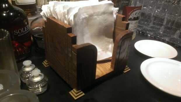 aquí es un sostenedor de la servilleta de lujo Casa para tus fiestas de Gatsby. No tome eso con un láser y pegados juntos en un broche de presión! Materiales: 24 x 8 pulgadas de 3/8" de madera dura (usé 1/2" roble, pensando que era 3/8"... hecho corte láser complicado...) pequeña cantidad de MDF de 1/4" Cinta de enmascarar Pintura en aerosol Pegamento para madera Tornillos pequeños