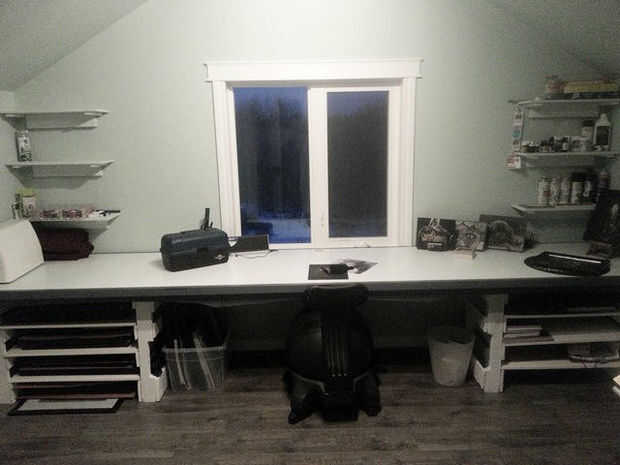 Un gran espacio para coser, pintar, trabajar en mi arte de Scratchboard. La mesa es sólida lo suficiente que puedo sit/stand en él fácilmente. Sólo hay que montar alguna iluminación permanente, añadir unas cortinas para las ventanas y tal vez algunos dibujar cortinas eventualmente para ocultar la estantería. Soy un campista feliz! Costo = alrededor de $30 para dos hojas MDF y quizás 20 tornillos. Todo lo demás era libre o sobrante.