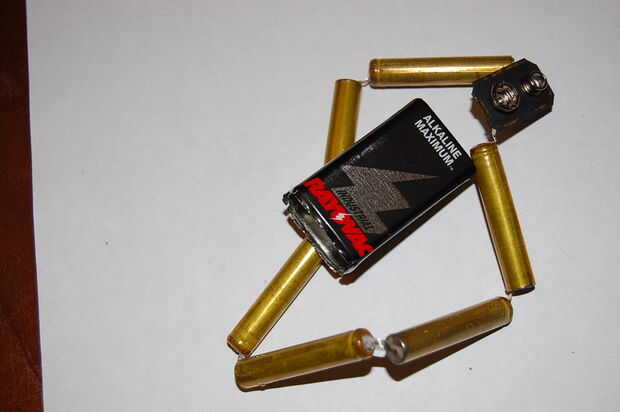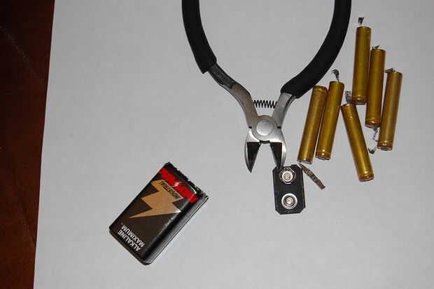 Oh sí - podemos también utilizar pilas de 9v - les rompan y libre el 6 AAAs poco dentro. ¿(Alguien ha aparte un RadioShack 9v últimamente? Has substituyeron el tamaño AAA con una pila de cosas rectangulares plana.) Pero prefiero usar el soporte del circuito Snap 9v masa, pero supongo que podría requerir más resistencias y no tienen idea cómo hacerlo.