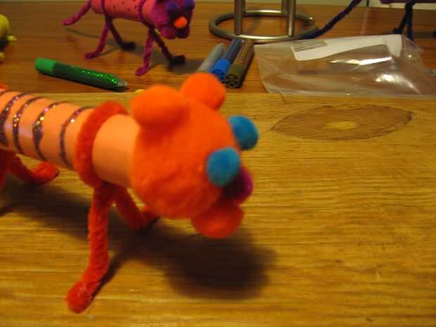 Con la pistola de pegamento caliente, pegar los rasgos faciales a la cabeza y pegar la cabeza a un extremo del cuerpo.