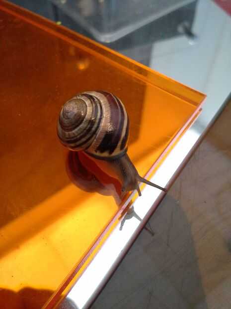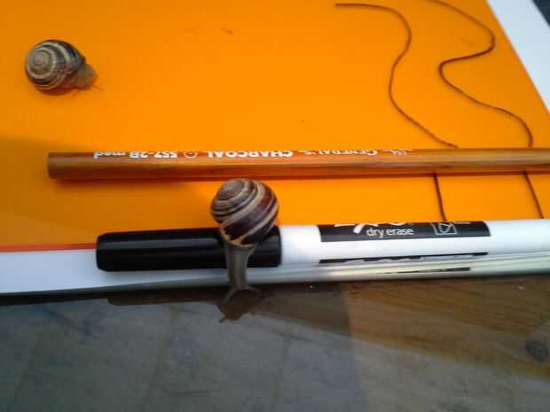 Entonces traté de guiarlos por el dibujo con marcador expo en un pedazo de acrylite que yo tenía por ahí. Este pequeño caracol siguió el camino hacia abajo de la línea... alrededor de la curva... y luego lo olvidé. Navegan por el sentido del olfato, por lo que creo que fue porque el marcador tenía un fuerte olor a químico cuando recién fue aplicada. Estoy seguro de que algo se puede hacer con esta información! Alguien debería hacer algo. (/ desnudo nudge, querido lector!)
