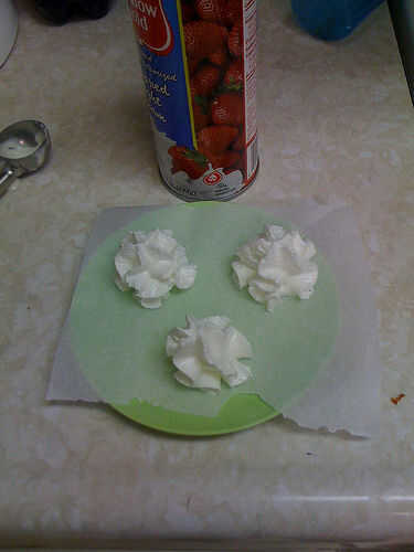 Squirt algunos crema batida en pergamino.  Batir la crema a ti mismo, añadir azúcar y colocar en una manga pastelera con una punta de estrella, o puede utilizar un bote como hice yo.