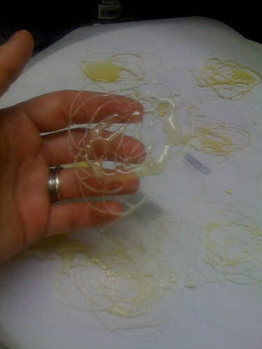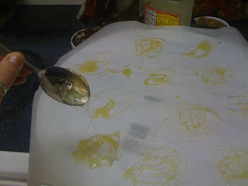 Tomar una cuchara y rociar azúcar caliente en círculos en papel de pergamino. Tenga cuidado; el azúcar fundido es caliente y pegajoso. No sale nada en usted.