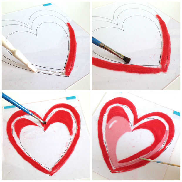 Trabajando en pequeñas secciones, repita los pasos 3-5 con diferentes colores de arena para llenar en todas o la mayoría del corazón como se desee. Tratar de garabatos y separarse curvado formas con el pegamento.