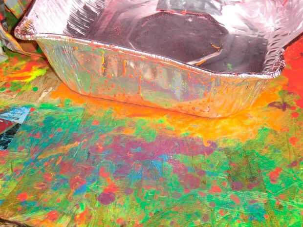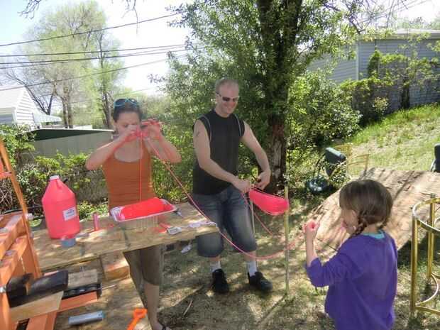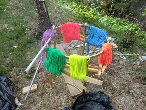 Mientras que desenvolver el rodillo en la pintura, otra persona se envuelve alrededor de los polos de secado y una rasqueta de persona de la pintura en el hilo. Esta es la parte muy tediosa. Asegúrese de que no deje las piezas blancas en la cadena. Al llegar al final del rollo quiere enredarse. En lugar de intentar tirar de él aparte, desenrolle cuidadosamente la bola de hilo pintados bancos. Si tira hará un montón de nudos corredizos, y bien, no es divertido.