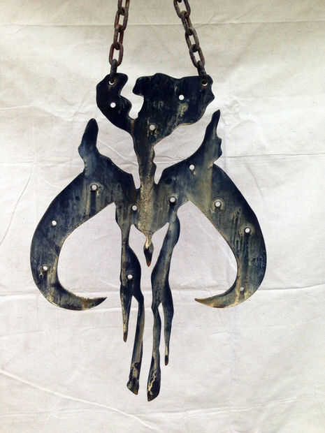 Esta es una de una buena obra de arte que fue hecha especialmente para una exposición de arte de Star Wars. Hay tantos detalles únicos que no podría nunca ser recreado exactamente. Quería que parece había sido colgado en el desierto para más de 100 años, que disparó y la erosión. Fue mucho en hacer esto... aquí están los detalles: hice el diseño y luego por chorro de agua corte de 3/16 grueso acero. Se fue luego con chorro de arena y se aplicó una pátina oxidada. Un Maestro Herrero me ayudo con la "bala" y también permanentemente soldar la cadena. Se pesa aproximadamente 11 libras y 19" de ancho x 26" de altura. La cadena añade otro 11" en altura.