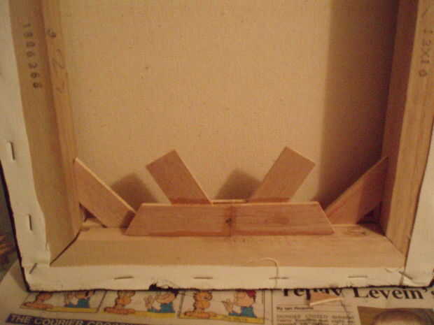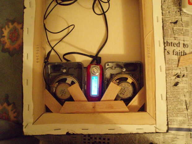 Ahora, todo lo que tienes que hacer es montar los altavoces en la parte posterior de la pintura. Usé algunos restos de madera para sostenerlos en su lugar. Esto también me permite quitar los altavoces si quiero. Hay muchas maneras para pegarlas, pero en mi nuevo lugar de vida estoy corto en suministros. A continuación, sólo limpiar los cables y conecte el reproductor de MP3. Listo...
