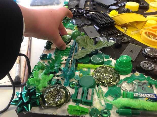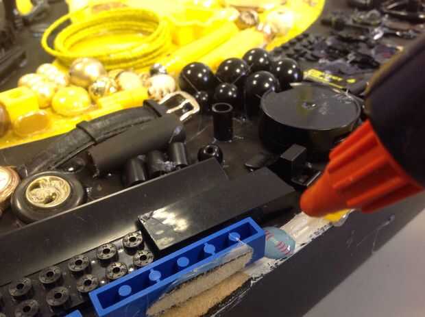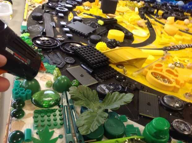 Empezar por pegar los objetos en el diseño. Usted puede pegar el objeto entonces fijarla o pegamento la superficie y fije el objeto. Pegar luego la colocación es más eficaz en objetos como plumas o reglas que son dificiles de conseguir el pegamento en la forma del tema propuesto a ser fijo. Sin embargo pegado la superficie entonces fijación es la manera más rápida y más segura. Es difícil quemarse a menos que te toque la cola y le da tiempo a orientar su objeto antes. Esta técnica es rápida porque puede pegar una superficie grande y pegue elementos por separado para el área de pegado.