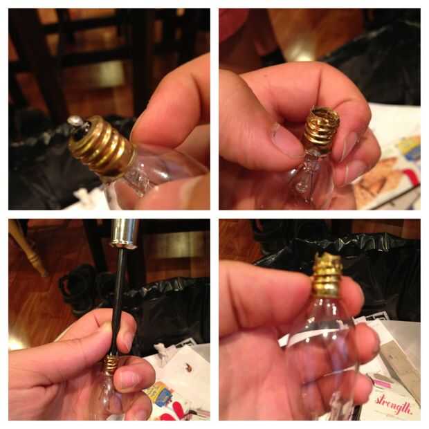 Para poder poner las cosas en el foco primero necesita hueco hacia fuera. Primero debes quitar el tornillo de la tapa de la bombilla, entonces tienes que utilizar los alicates para quitar todo el vidrio negro, una vez que lo hace tiene que suavemente golpee el vidrio en la bombilla con el destornillador y finalmente eliminar el vidrio sobrante.