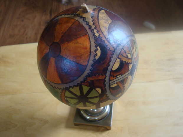Después de que la calabaza haya secado, coloco un serie de círculos diferentes. Más tarde convertir los círculos en los engranajes, superpuestas para añadir profundidad.