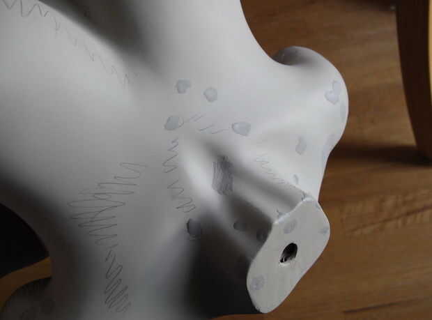 Una vez que piensa que es todo liso, es hora de centrarse en puntos altos, asperezas y hoyos. Usar imprimación semicurado como relleno para los hoyos que me parece - funciona mejor que el acristalamiento compuesto. Sentarse por una fuente fuerte de luz y seleccionar cuidadosamente las áreas problema - me los marca con un lápiz y un código visual que me permite saber cuál es el problema con esa zona.