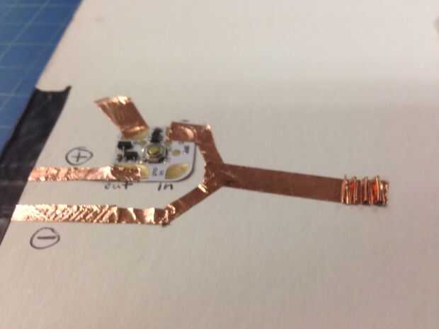 En este paso tenía sentido para montar la batería de forma permanente. I acordeón-doblar el extremo de un trozo de cinta de papel para la batería descanse sobre el terminal negativo. Luego, alineó otro pedazo de cinta con el terminal positivo del disparador y había pegado abajo recto en la parte superior (+) de la batería. Presionando la batería estruja el papel arrugado para hacer un buen contacto, mientras que contamos con el pegamento para dar un contacto en el lado positivo. Un pedazo de cinta sobre todo lo mantiene en su lugar.