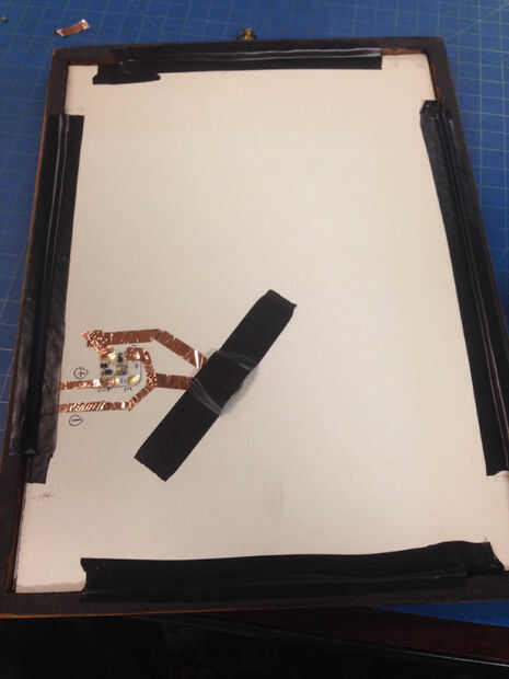 Utiliza dos pequeños trozos de cinta para sostener los bordes de la impresión en la lámina perimétrica, les volcó y había colocado en el marco. Este marco particular era muy barato y no tenía clips para sostener el arte o el vidrio en su lugar. por lo tanto aquí se puede apreciar que mantiene en su lugar con cinta aislante. Esperemos que su marco es un poco mejor!