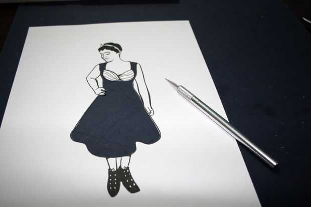 Utiliza el x-acto cuchillo, cortar el vestido en el dibujo. Asegúrese de que usted permanecer en el interior de las líneas negras, ya tendrás tu imagen para tener el contorno allí cuando termines. Puede que necesite utilizar una mano dura, a veces la hoja no se corte a través de tarjetas en el primer paso si estás demasiado ligera, y volver sobre un punto varias veces puede incrementar las posibilidades de lágrimas o bordes ásperos.
