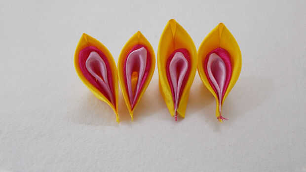 De la misma manera, cortar una cinta de raso color rosa oscuro de 6 cm y doblarlo.
