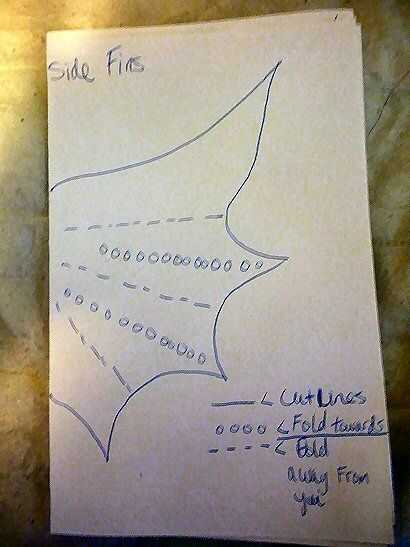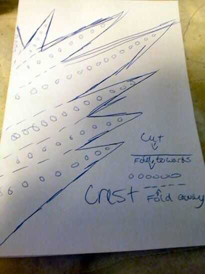 1 cortar las aletas y la cresta de su elección de papel de construcción o cartulina. (Yo usé azul para la cresta y el cielo azul de las aletas).