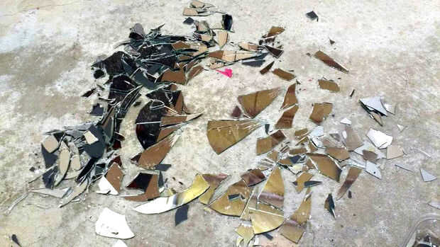 Nota importante: Cuando se rompe el mirror(s), asegúrese de usar guantes y lentes, además de mangas largas, pantalones y zapatos cerrados. Esto puede sonar como overkill, pero créanme es necesario como los pedazos de espejo volarán por todas partes! Corte mi mano con mi primer golpe de martillo de pensar no que tenía guantes. Puede ser un pequeño corte (Afortunadamente), pero sin embargo, el espejo me mostró que no estaba molestando! Así que prepárate y haz cubierto!
